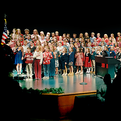 Third through fifth graders presented a winter concert Monday inside the Performing Arts Center. Substitute music teacher Anita Hancock (left) conducted the show and performances. The concert opened with students saying the Pledge of Allegiance, followed by performing the "Star-Spangled Banner."